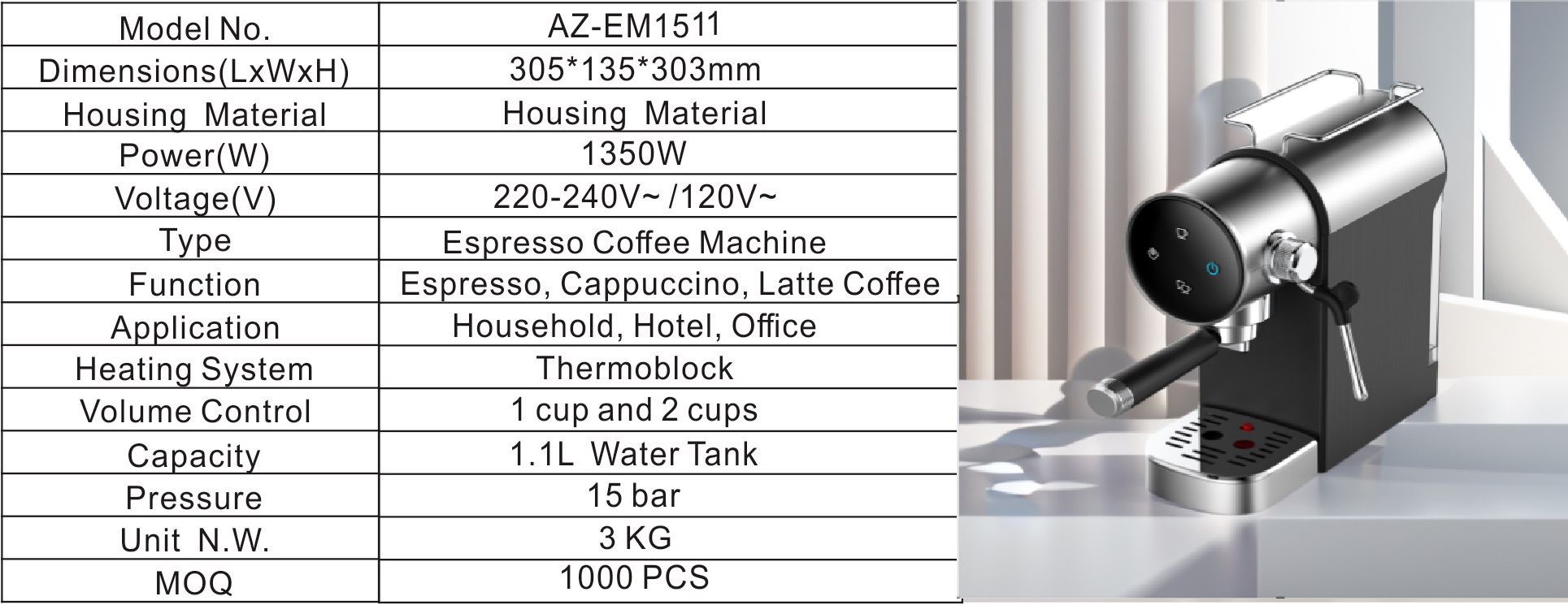 * WATTAGE: 1350W * Thermo-block heating system * Touch screen control panel * Pre-brew function * 15 bar pump produces a rich espresso * Steam/Hot Water selection * Steam wand produces steam for thick milk froth * 2 in 1 filter holder: single or double cups * Removable water tank (1.1L) * Removable drip tray for easy cleaning